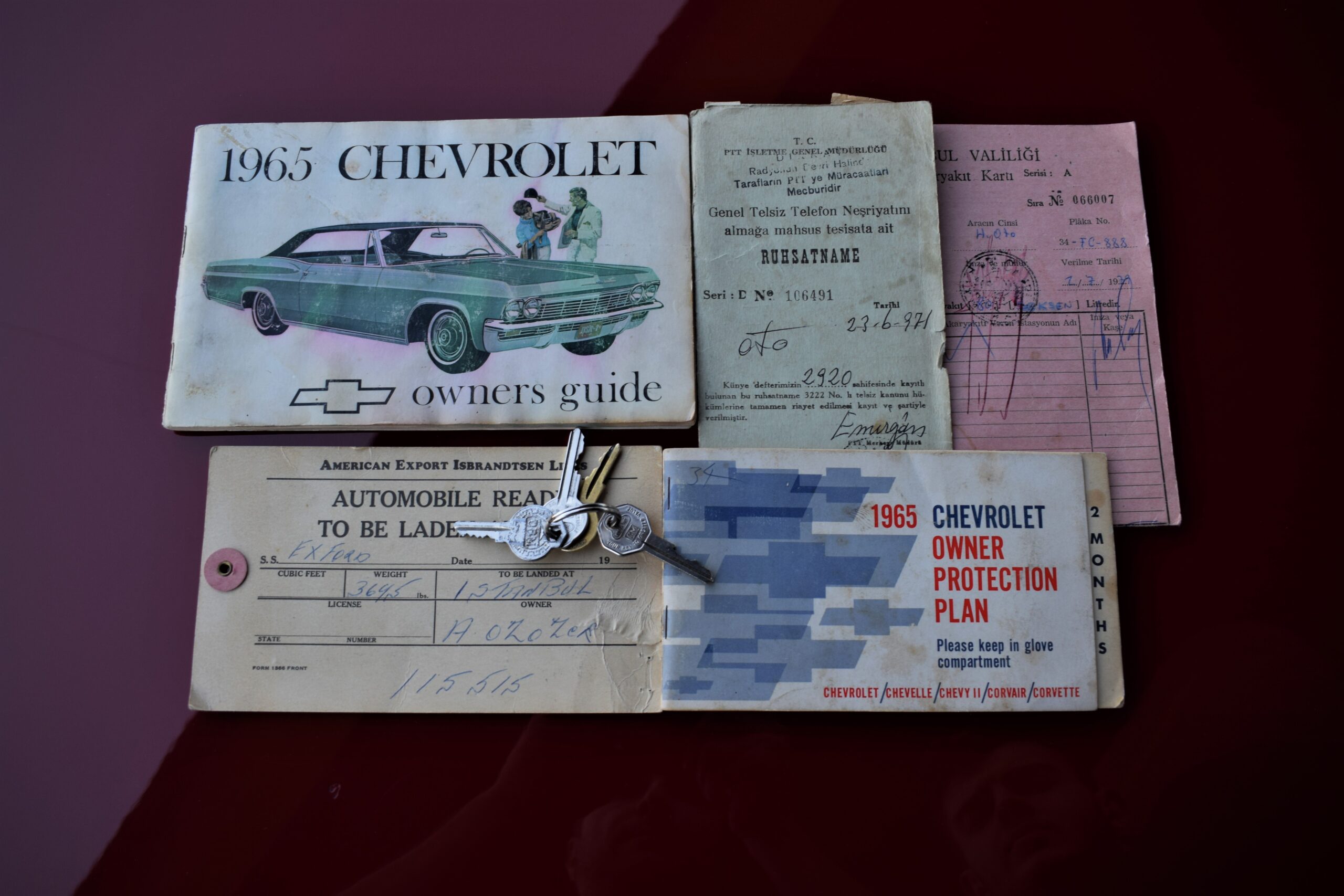 ARACIN İLK LASTİKLERİ – ÜLKEYE GİRDİĞİ İLK EXPORT KAĞITLATI – KULLANIM KILAVUZU – GARANTİ BELGESİ – DELCO TEYP RUHSATNAMESİ – SERVİS PLATE METAL ETİKETİ – GM ORJİNAL ANAHTARLARI MEVCUTTUR